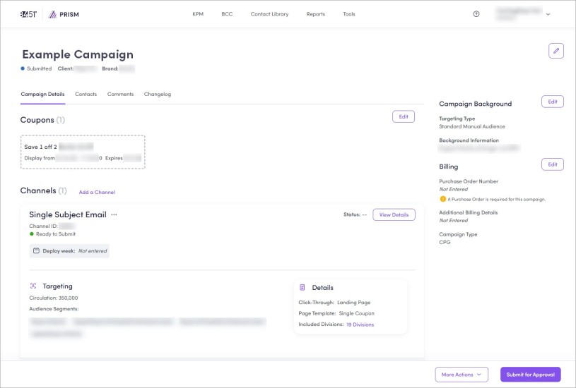 Individual Campaign dashboards provide a visual snapshot of your Managed Service Campaign data and information in 84.51° Prism.