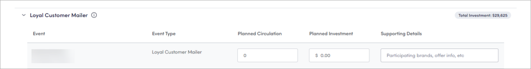 Click the arrow to see individual events (like Loyal Customer Mailer, MyMagazine, Boost Exclusives in LCM Offers sent to Kroger Boost members through LCM events; Provides extra value and savings for Boost customers as an exclusive benefit to their paid membership., and New at Kroger Introduces new items to Kroger customers with offers targeting category-relevant householdss with highest propensity for trial.). You can also see the Event Type, Planned Sums total planned value from plan groups, aggregated based on the view or report in which it appears. Incudes everything but Boost. Circulation, Planned Investment, and Supporting Details for each event.
