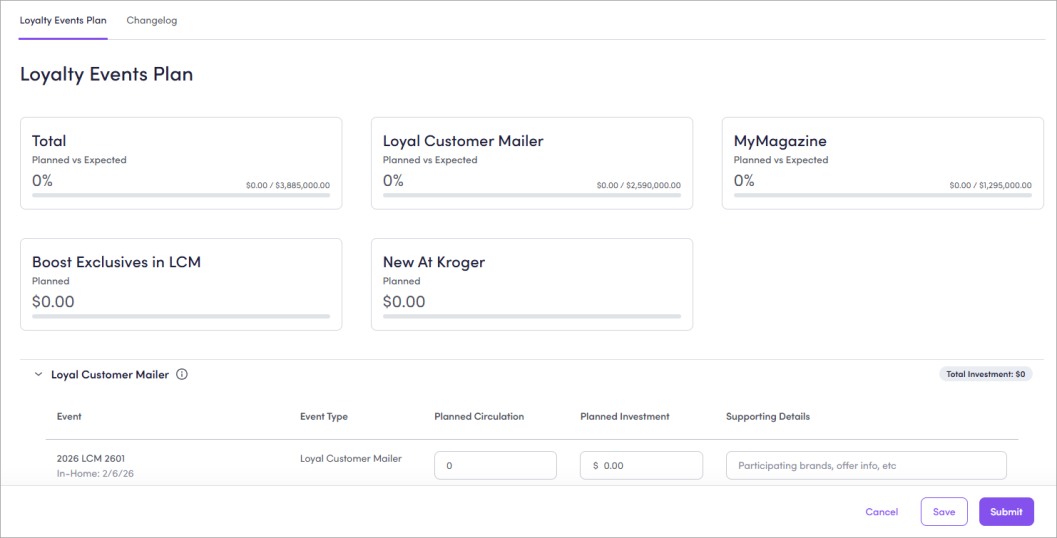 Your Yearly Plan displays your planned circulation The number of households where the coupon is sent. to Kroger's ask for the Total Year as well as specific breakdowns for Loyalty Events (like Loyal Customer Mailer Reward and retain current buyers with hyper-relevant offers served via a combination of direct mail and digital channels. and MyMagazine Reward current buyers and acquire relevant category-buying households with personalized offers and equity advertising served via combination of direct mail and digital channels.).