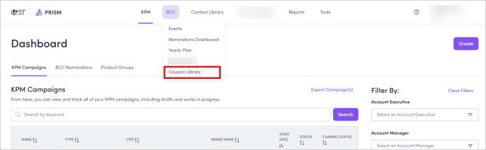 You can also create a coupon from either the main 84.51° Prism or the BCC Nominations dashboard by clicking Create.