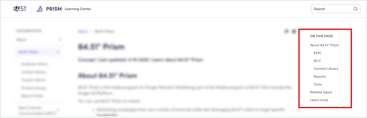 The Learning Center is your best option for 84.51° Prism support as it offers how-to instructions, video tutorials, information about key concepts and methodology, helpful resources, FAQs, and release notes.